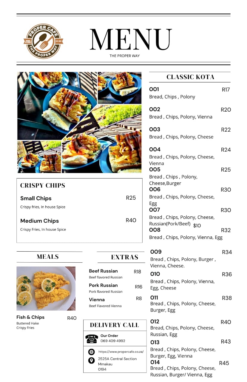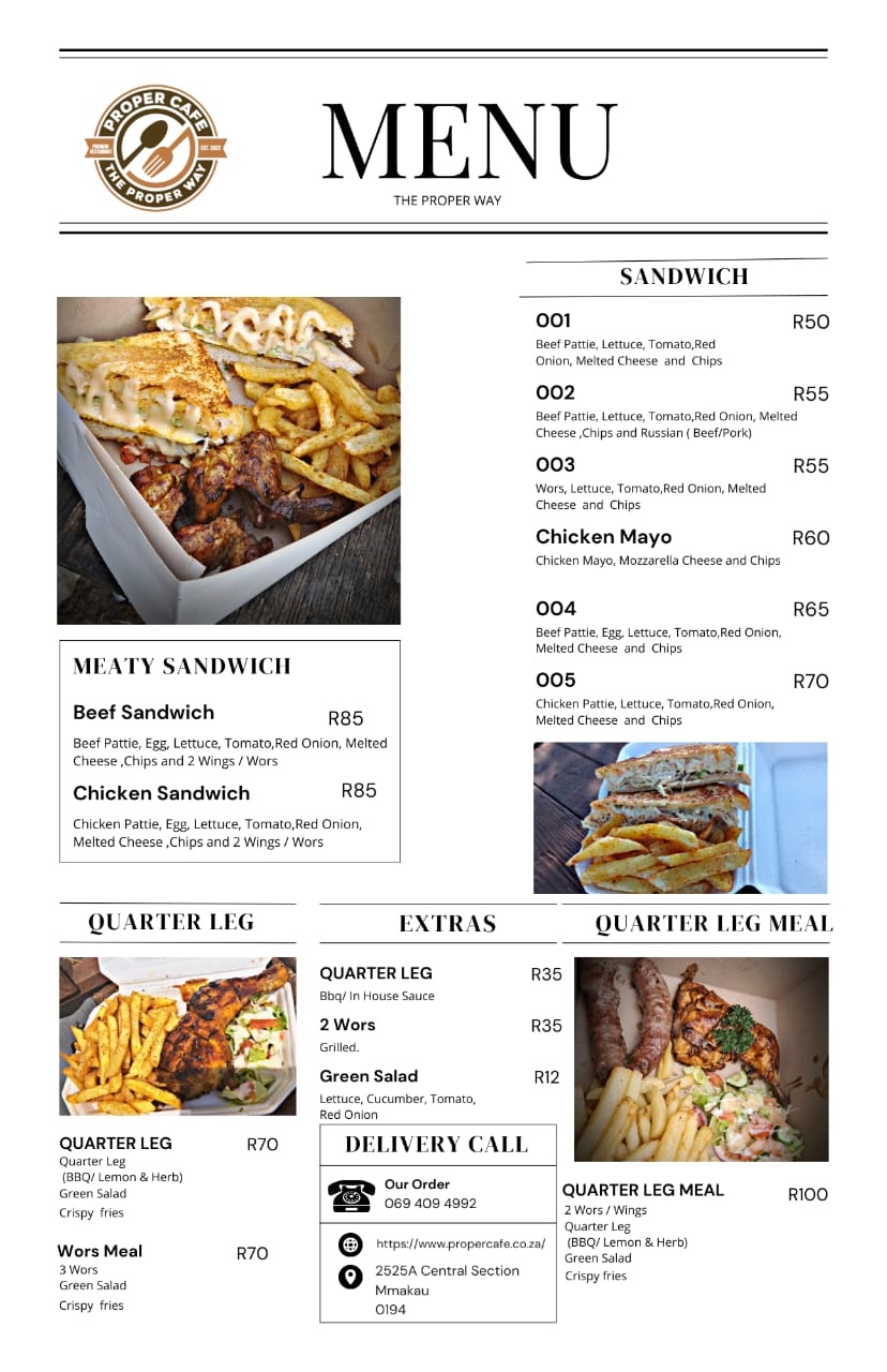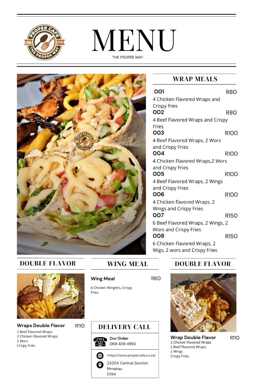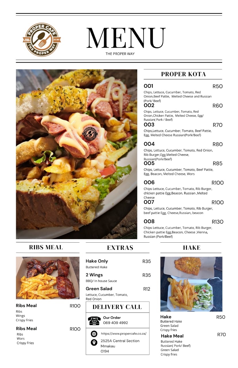 Proper Cafe was founded with a purpose to serve and revolutionize the African township fast food industry, with the aim of offering high quality grilled chicken, kotas, wraps, traditional meals and desert.